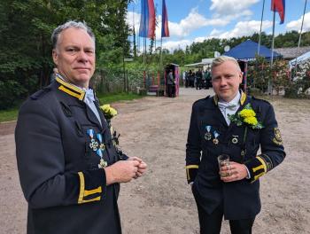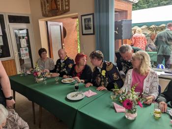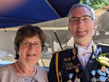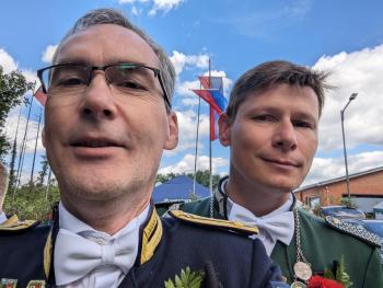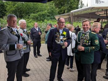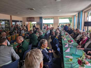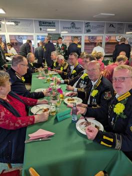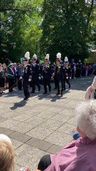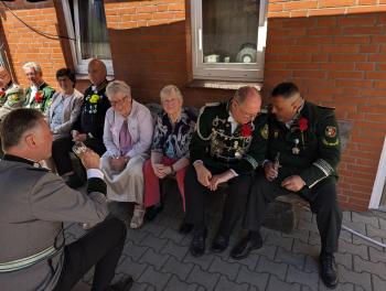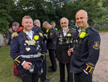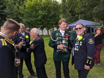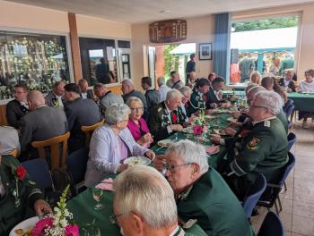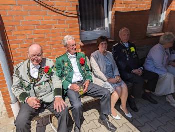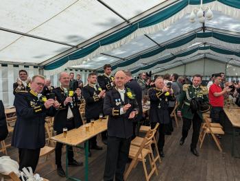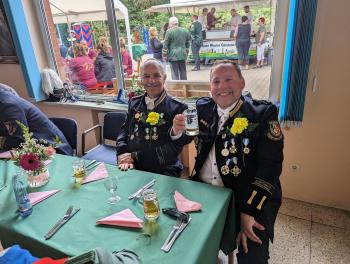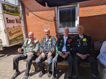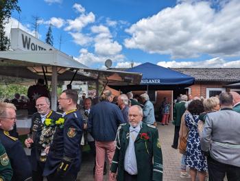 Am Morgen haben wir uns im Gardelokal getroffen, um gemeinsam zum Antreten der Gilde auf dem Marktplatz, einzutreffen. Von dort ging es im gemeinsamen Marsch zur neuen Majestät, Herbert und Heidrun Markgraf, zum Königsfrühstück. Sehr herzlich sind wir wieder empfangen und verpflegt worden. Leider verging die Zeit so schnell, das wir nicht merkten wie spät es war. Schon mussten wir weiter, um mit unseren Gästen die am Wasserturm warteten, einen Ummarsch durch die schöne Stadt Lüchow zu machen, der uns zum Festzelt auf dem Schützenplatz führte. Der Zeltwirt war sehr überrascht, denn er hat nicht mit uns gerechnet. So sind einige Kammeraden eingesprungen und haben Getränke gezapft und andere haben diese verteilt. Zum Kompanieabschluss hat der Spieß in seiner Rede, die neue Kronprinzessin Maja Reubert und den letzten Kronprinzen Frederic Duhm noch einmal hochleben lassen. Deren Eltern gehören zu unserer Gardekompanie.