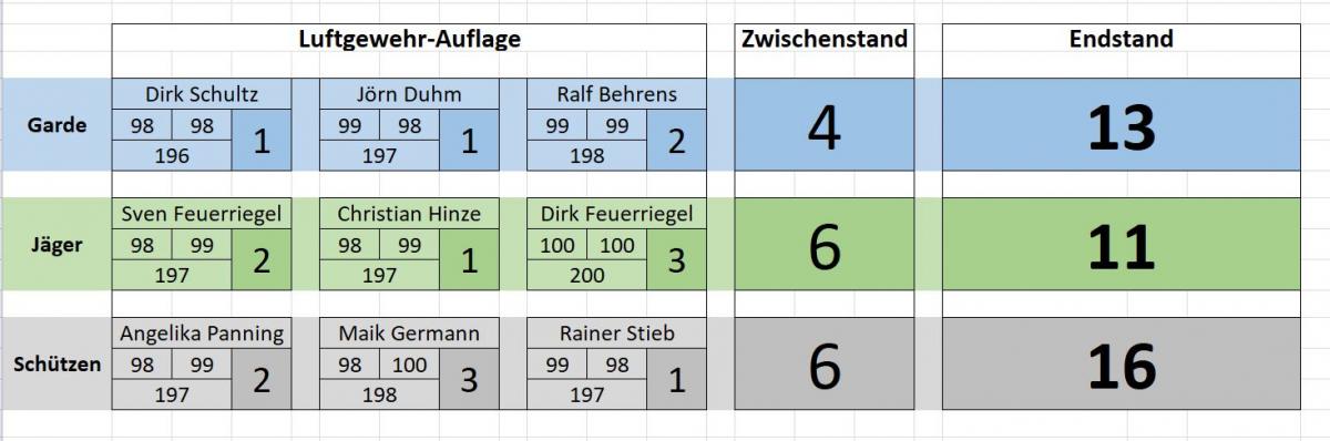 Dirk Feuerriegel und Maik Germann brillierten in der Disziplin Luftgewehr Auflage, beide erzielten 100ter Serien. Wobei es Dirk Feuerriegel sogar zweimal gelang! Beide holten ebenfalls die vollen drei Punkte für ihre Kompanie. Auch die anderen Ergebnisse dieser Disziplin lagen nicht unter beachtlichen 196 Ringen und sind damit sehr gut gewesen. So kam es aus einem Feld von neun Schützen zu folgendem zweiten Zwischenstand: 4 Punkte Garde, 6 Punkte Jäger und 6 Punkte für die Schützen. Aus beiden Zwischenständen ergab sich der Endstand: 13 Punkte für die Gardekompanie, 11 Punkte für die Jägerkompanie und 16 Punkte für die Schützenkompanie.