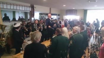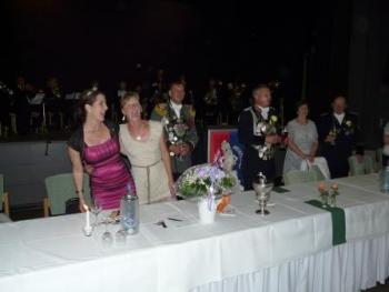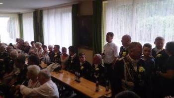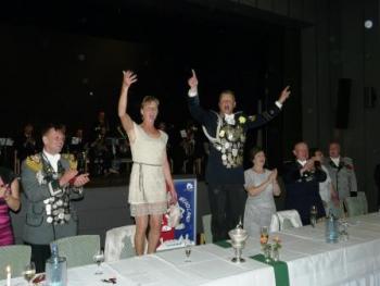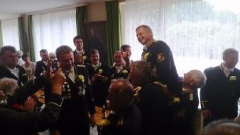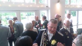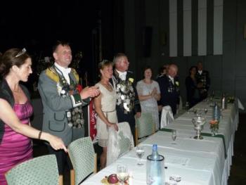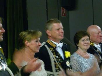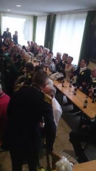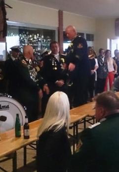 Nach einer Stärkung im Festzelt ging auf den Schießstand zum Königsschießen. Die Garde hatte die Hoffung auf eine Majestät aus den eigenen Reihen. Auf dem Weg dorthin wurde die Garde noch von einem heftigen Regen überrascht - was sie jedoch nicht zum Umkehren brachte. Nach dem Schießen machte es der Gildeoberst bei der Verkündung mit Witz und viel Musik sehr spannend. Die Schießergebnisse zweier Gardisten lagen dicht beeinander. Thorsten Behrens hatte die zweitbeste Zehn doch Hanno Jahn konnte sich mit einer perfekten Zentrumszehn durchsetzen. Unsere Stimmung auf dem Schießstand war sehr ausgelassen. Die auf dem Schießstand durch den in "Unruhestand" stehenden temporären Adjutanten Rainer Langenbach unterbrochenen Gratulationen wurden im Gildehaus fortgesetzt. Bei der Proklamtion im großen Saal des Gildehauses sah man dem neuen Majestätenpaar Hanno und Katrin Jahn Ihre Freude über die errungene Würde an. Mit einer lockeren Rede führte sich die neue Majestät in sein neues Amt ein und eroberte damit die Herzen der Anwesenden im Sturm. Seinem Wunsch nach einer guten Beteiligung beim Königsball zu folgen, wird allen eine Selbstverständlichkeit sein.