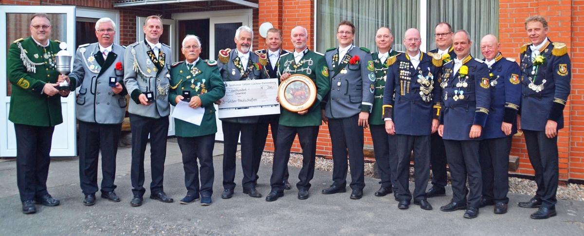 Der Sparkassen-Vorstand Thorsten Pils (von links) überreichte den Drei-Gilden-Pokal an Axel Schmidt von der Schützengilde Lüchow, der auch die Einzelwertung vor Maik Germann und Heinz-Dieter Wieczorek (Gilde Hitzacker) gewonnen hatte. Zur siegreichen Mannschaft zählten ferner (weiter von links) Vizekönig Manfred Heinemann, Hanno Jahn, Dirk Feuerriegel, der die Ehrenscheibe gewann, sowie Gordon Raeder, Sven Feuerriegel, Axel Noak, Karsten Schulz und Ralf Behrens. Über den zehnten Sieg der Lüchower Gilde in Folge freute sich Oberst Hans Brünger mit Schützenkönig Thorsten Behrens.