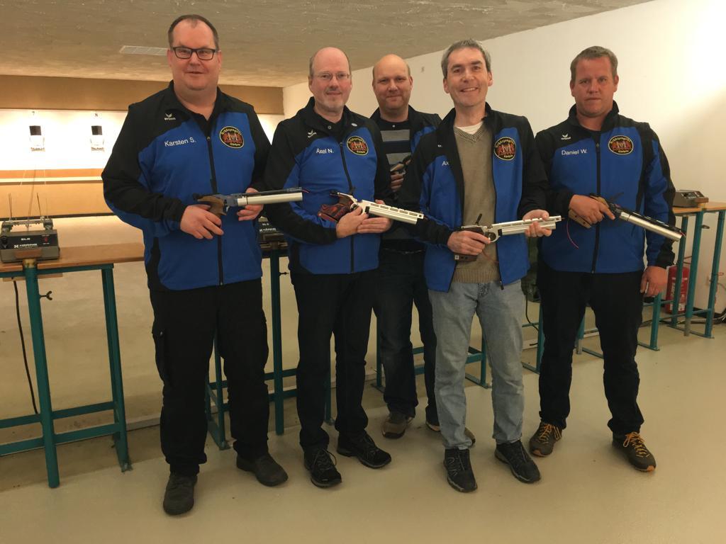 Daniel Tamm startete wieder an Platz eins. Das Ergebnis seiner ersten Serie lag mit 86 Ringen sechs Ringe hinter dem seines Herausforderers. In der zweiten Serie holte Daniel einen Ring auf, den er in der dritten gleich wieder abgab. In Serie vier konnte er noch einmal zwei Ringe aufholen. Die reichten aber leider nicht zum Punktgewinn. Er verlor mit 362:366 Ringen. Noch schwerer hatte es Karsten Schulz an Platz zwei. In Serie eins geriet er mit 81 zu 90 Ringen deutlich ins Hintertreffen. Das spornte seinen Kontrahenten wohl etwas an, denn er wurde besser und konnte Karsten weiter hinter sich lassen. Am Ende ging auch dieses Match mit 349 zu 367 Ringen verloren. Auch Daniel Wagenhals konnte seinen Wettkampf nicht gewinnen. Sein Endstand lautete 345 zu 366 Ringe. Damit war die Differenz sogar noch größer als die von Karsten Schulz. An Position vier kämpfte Axel Brünger. In Serie eins hatte er den besten Start erwischt und schloss diese mit fünf Ringen Vorsprung ab. Serie zwei zeigte eine kleine Verschlechterung, die er auch in Serie drei und vier hielt. Doch sein Gegner verbesserte sich deutlich und überholte Brünger noch. So ging auch in diesem Duell mit 343 zu 355 Ringen verloren. Die letzte Hoffnung lag nun bei Axel Noak auf Startposition fünf auf einen Ehrenpunkt. Nach dem ersten Durchgang lag er mit seinem Mitstreiter gleichauf. Beide hatten 88 Ringe geschossen. Serie zwei zeigte einen deutlichen Unterschied von 15 Ringen, die Noak hinten lag. In den Serien drei und vier konnte er sich wieder etwas vorkämpfen, doch zu einem Sieg reichte es auch diesesmal nicht. Das Endresultat ergab 343 zu 353 Ringe. Damit wird die Mannschaft nun in der nächsten Saison in der Verbandsliga an den Start gehen.