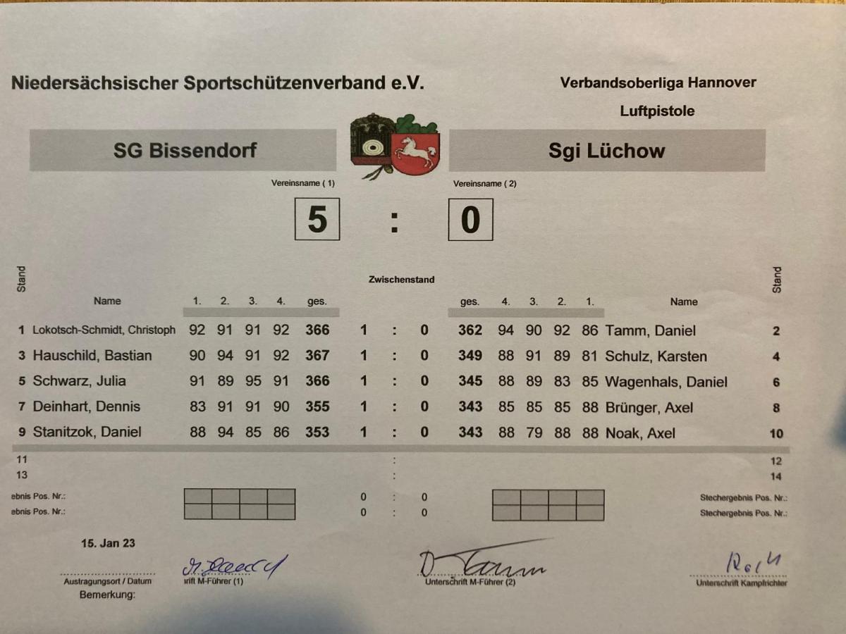 Der letzte Rundenwettkampf in dieser Saison fand für die Verbandsoberligamannschaft der Lüchower Gilde am Sonntag den 15. Januar 2023 bei der Schützengilde Vorwerk bei Celle statt. Dazu war diesesmal die komplette Stammmannschaft gegen einen schweren Gegner aus Bissendorf angetreten. Schwer deshalb, weil die Bissendorfer schon im Durchschnitt ihrer Einzelergebnisse sehr gut waren. So kam es, dass die Lüchow Mannschaft mit 0:5 eine krachende Niederlage einstecken musste. Damit erreichte das Gildeteam den sechsten Tabellenplatz zum Abschluss der Saison und ist damit aus der Verbandsoberliga abgestiegen.