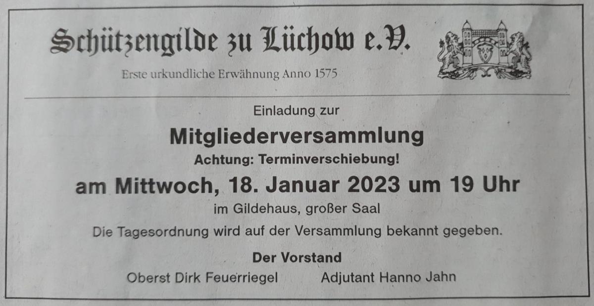 Mitgliederversammlung am 18. Jannuar um 19 Uhr im Gildehaus